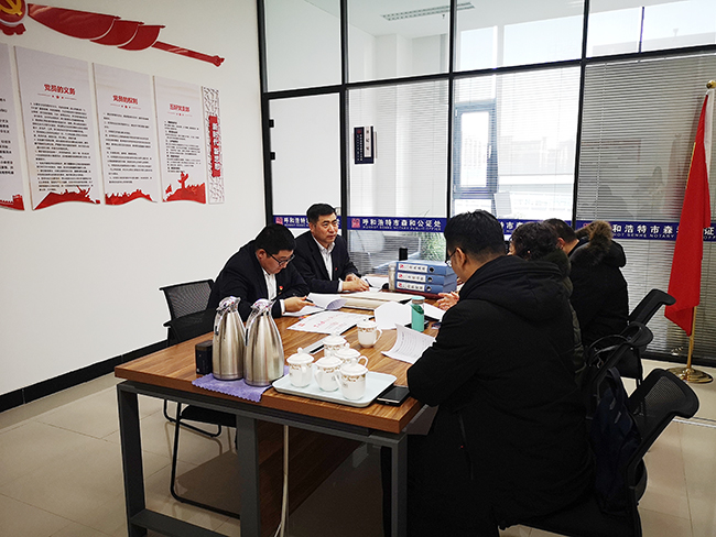 2020年12月30日下午,为加强新时代党支部建设工作,提高党支部标准化、规范化建设水平,推进党支部全面进步、全面过硬,按照《呼和浩特市委组织部印发〈关于进一步夯实基层基础 大力推进“最强党支部”建设的实施方案〉的通知》要求,派驻司法局纪检监察组组长、呼市司法局党组成员董乌云携指导组一行,对我处 “最强党支部”建设进行指导。 指导组一行实地参观了我处办证大厅、各个业务部门、温馨遗嘱室、党员活动室等办公区域,详细了解了森和基础设施建设以及人员配备情况,并认真查看了党员示范岗位、党务公开栏以及党建文件材料等等。