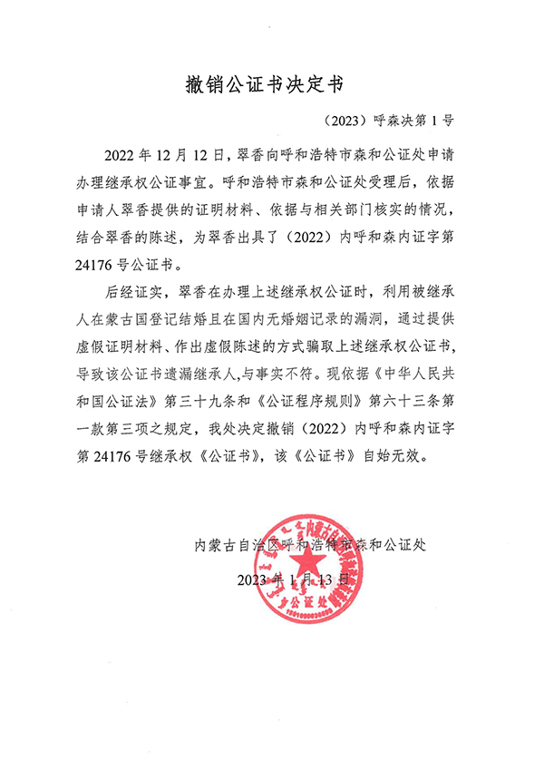 2022年12月12日,翠香向呼和浩特市森和公证处申请办理继承权公证事宜。因翠香在办理公证过程中故意隐瞒事实,提供了不真实信息。现依据《中华人民共和国公证法》第三十九条和《公证程序规则》第六十三条第一款第三项之规定,我处决定撤销(2022)内呼和森内证字第24176号继承权公证书,该公证书自始无效。